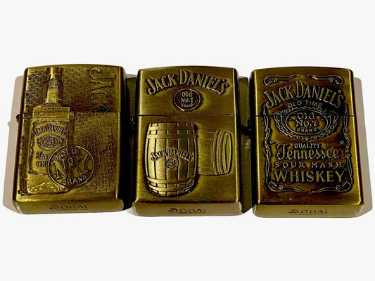3 Pack Jack Daniels Embossed Metal Design Windproof Oil Lighters Brass Colour