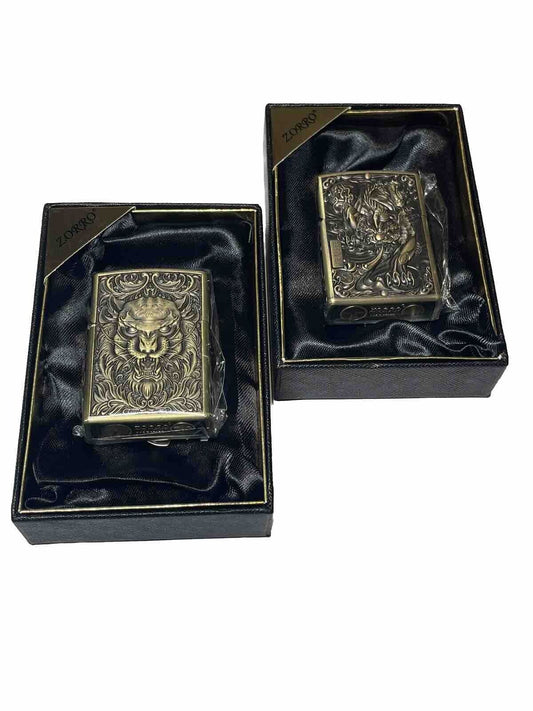 2 Pcs Zorro Windproof Oil Lighter Heavy Duty Antique Brass Design Lion & Dragon