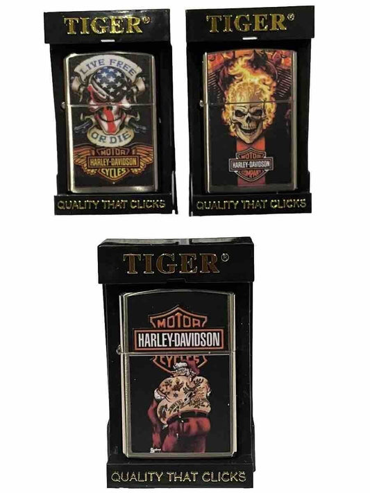 3 Nos Harley Davidson Tiger Brand Windproof Oil Lighters Zippo Fluid Skelton