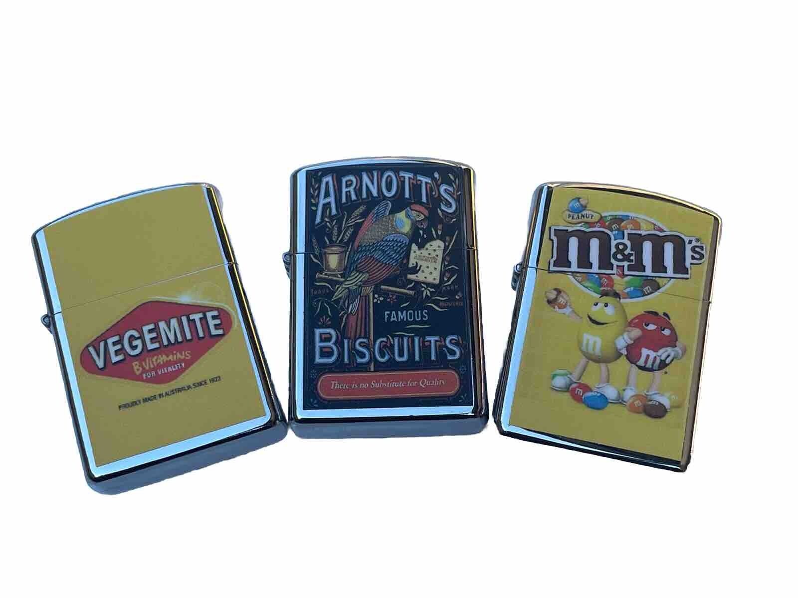 3 PCs Windproof Oil Lighter Novelty Designs Arnotts Biscuits Vegemite M&m Coco. Condition is New. Sent with Standard Parcel Delivery.