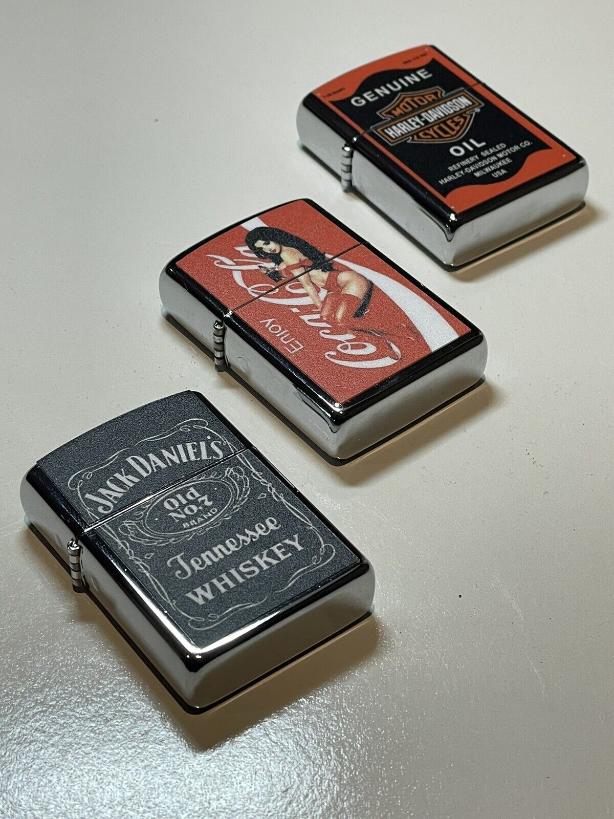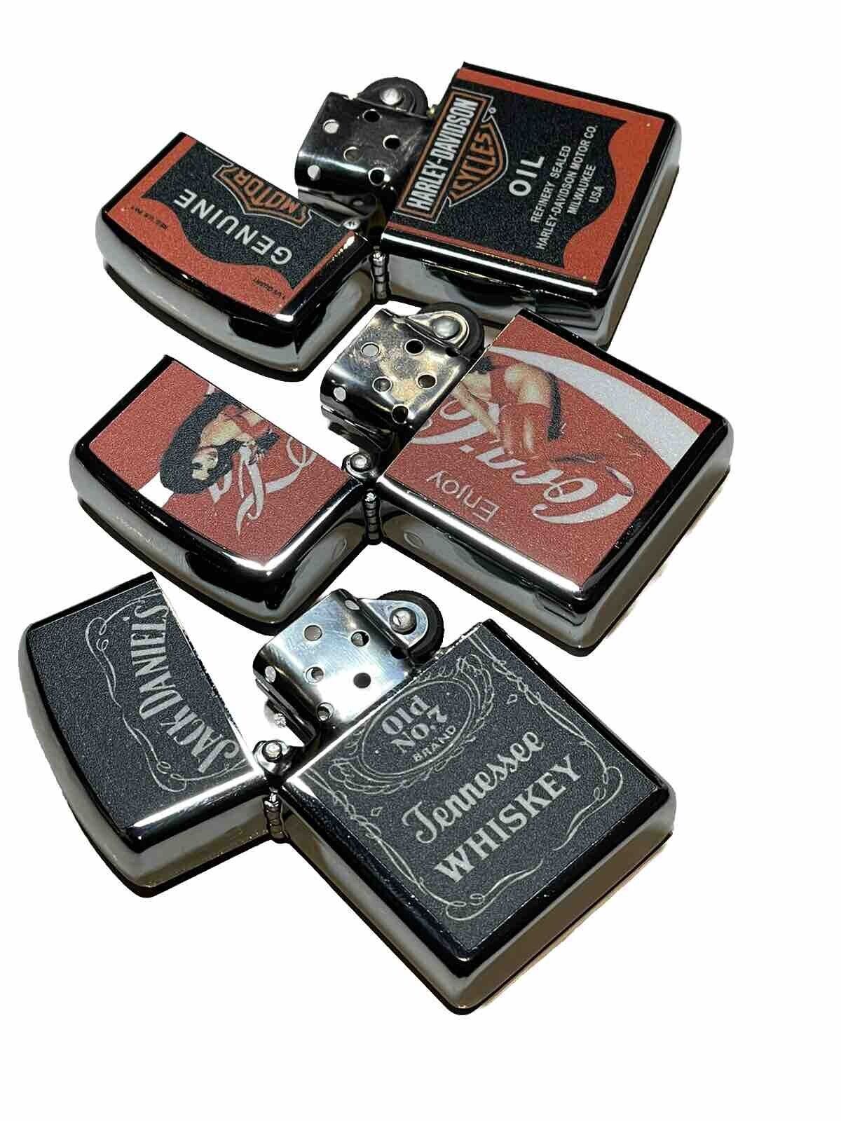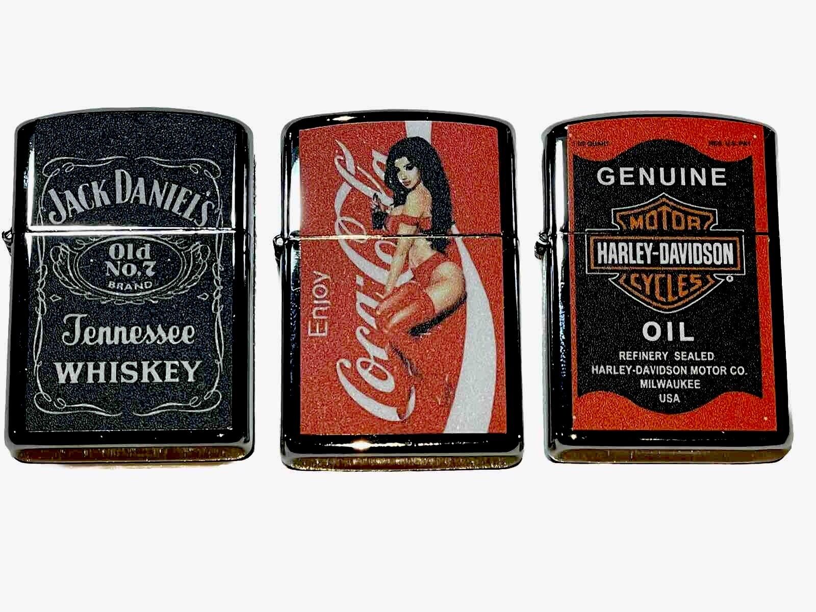 3 PCs Windproof Oil Lighters Vintage Style Jack Daniels &Coke Harley Davidson